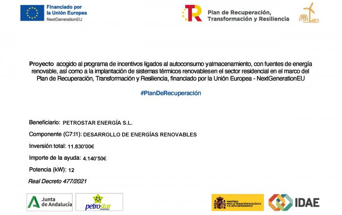 PETOSTAR ENERGIA SL ha recibido una ayuda de la Unión Europea con cargo al Fondo NextGenerationEU, en el marco del Plan de Recuperación, Trasformación y Resiliencia, para (denominación de la actuación/proyecto) dentro del programa de incentivos ligados al autoconsumo y almacenamiento, con fuentes de energía renovable, así como la implantación de sistemas térmicos renovables en el sector residencial del Ministerio para la Transición Ecológica y el Reto Demográfico, gestionado por la Junta de Andalucía, a través de la Agencia Andaluza de la Energía